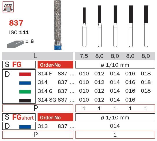 High Speed Diamond Bur 837L with an Extra Long Flat Fissure is perfect for decay removal and cavity preparations. Perfect for crown and veneer preparations. Great to remove tricky interproximal sub gingival caries. Short shank is perfect to reach those hard to reach areas. Price per pack of 5.