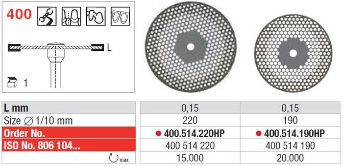 Shape 400 - Open Mesh diamond disc for separating and contouring of ceramics, acrylics and plaster. Flexible, with excellent vision, highest material reduction and smooth grinding performance. Mounted.