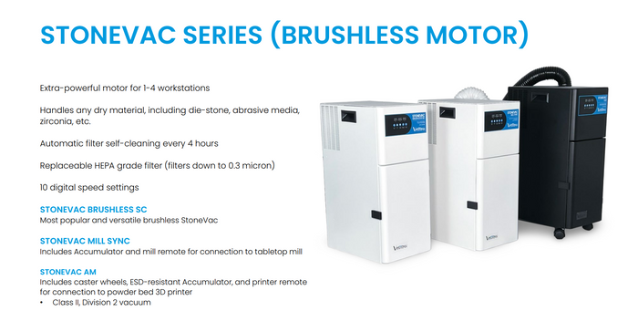The Vaniman StoneVac Brushless SC is a high-performance dust collector designed for heavy-duty applications in dental, jewelry, and industrial settings. It is particularly well-suited for collecting heavier dust and particulates, including precious metals, and is ideal for green state finishing.