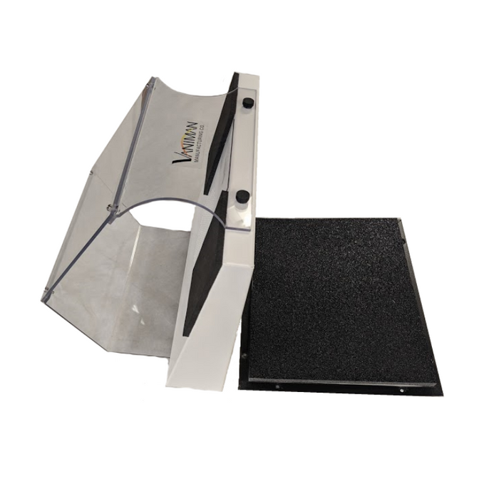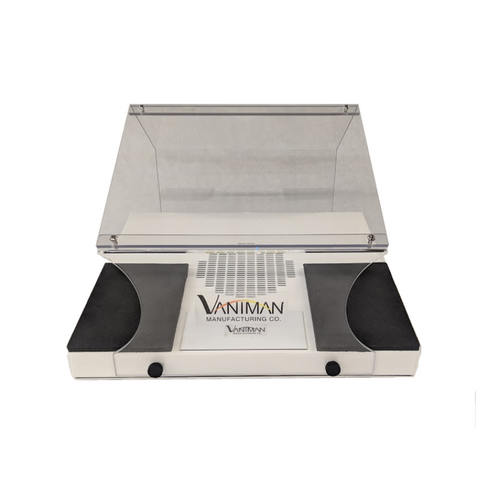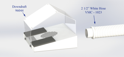 The Downdraft is a bench-top dust collection accessory that creates a semi-enclosed dust collection area when using hand pieces. It features a removable protective shield, padded wrist rests, vent selection, and a padded catch tray. Made from durable Plexiglass and steel.