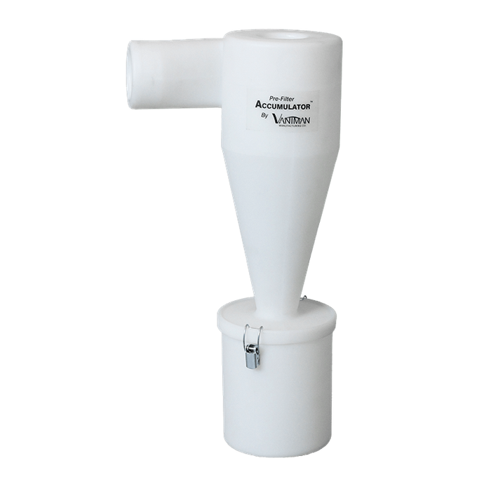 The Accumulator is a Pre-Filter cyclonic device that is designed to collect and protect. It collects dust, precious metals, sandblasting media, zironia, acrylic, and other materials prior to clogging up the filter which results in longer motor and filter life of your dust collector.