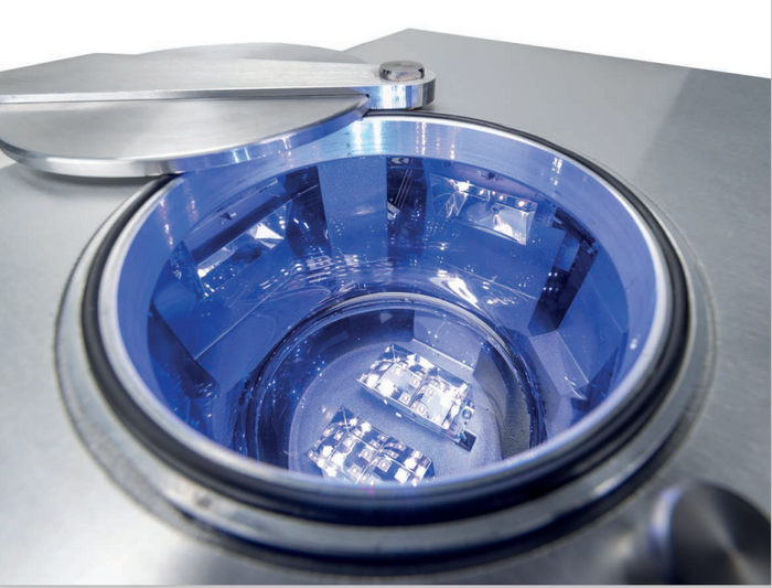 PHOTOPOL VACUUM+GAS is equipped with 6 special circuits (8-LEDs Hi-Power SMD, 48 LEDs in total) with optical reflectors, developed to maximize the irradiation effect. The operating spectrum allows to post-cure components created with 3D printers working both 385nm and 405nm wavelenghts. It features a Touch-Screen Full-Color display to select parameters and to store programs. All curing cycles can be performed under vacuum (a powerful but small oil-less pump is built-in) and the unit can be connected to an external protective gas appliance (Nitrogen N2) to comply with the existing Medical Device Regulations for Class IIa certified materials. The « Vacuum+Gas System» allows to flow into the working chamber only a fixed quantity of Nitrogen (1.5 litres per cycle) with an impressive very low gas consumption.