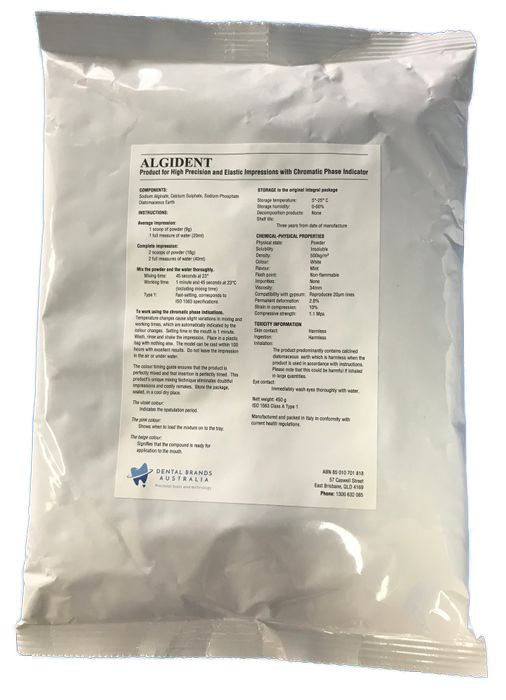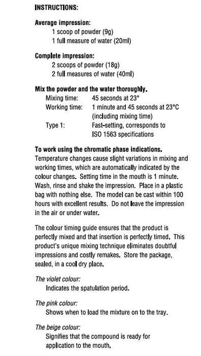 High precision alginate impression material with chromatic 3 phase colour indicator.