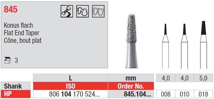 Flat end tapered shaped Electroplated Diamond burs for the straight handpiece. Price per pack of 3.