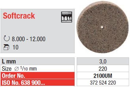 Soft, elastic multi-layered grinding discs for rapid operation on soft and elastic resins, soft reline, flexible splints and mouth guards. Low heat build up. Price per pack of 10 wheels and 1 mandrel.
