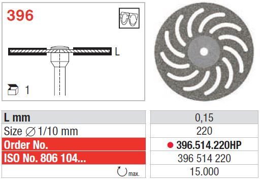 Shape 396 - Fine double sided diamond disc with arch shaped perforations for separation and contouring of ceramics. High removal capacity, high flexibility. Provided good visibility. Mounted.