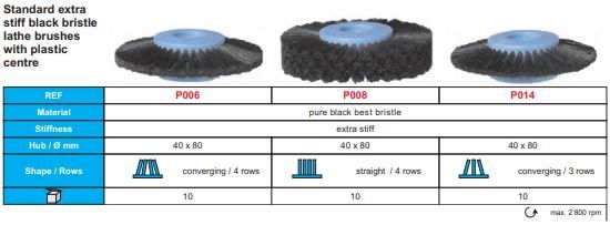4 Row converging extra stiff black bristl lathe brush with plastic centre. 80mm diameter.