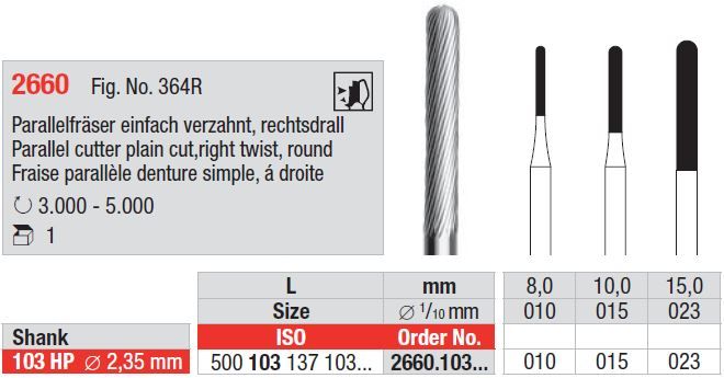 Edenta Milling Technique 2660/023. Parallel cutter plain cut, right twist, round.