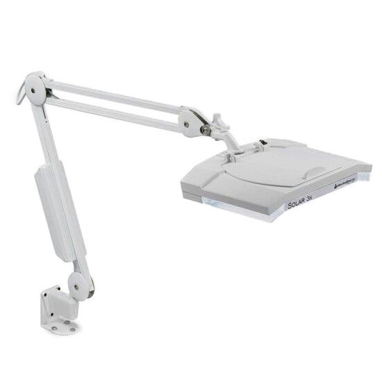 Bench lighting fitted with a large rectangular 3x diopter lens (1.75 x magnification). New design providing for pure white lighting over SMD LED bars.