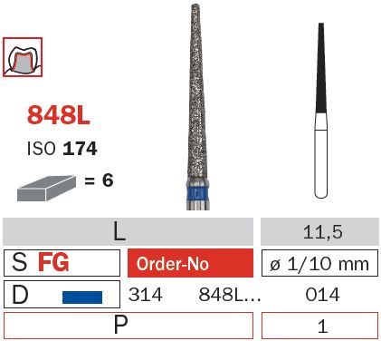 High Speed Diamond Dental Bur 848L has a Long Shank Tapered with Fine Flat End that is great for decay removal, and deep cavity preparations. Perfect for crown and veneer preparations. Price per pack of 5.